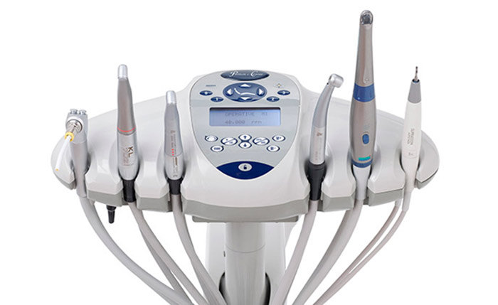 電腦控制的電動馬達: (診療椅右側的控制模組- 不再只是單純的提供氣及水), 在低速時可以穩定的控制轉速讓效率提升,並減少震動, 增加病人舒適感